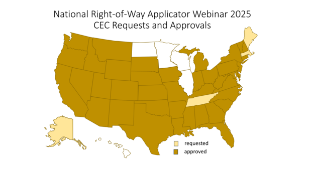 The National Right-of-Way Applicator Workshop specifically targets applicators and contractors applying to roadside, railroad, power line, and oil and gas right-of-ways working across multiple states.  The live webinar will be a one-day (6 training hours) applicator recertification course (see 2025 agenda) focusing on current technologies and best management practices associated with right-of-way weeds in the United States.